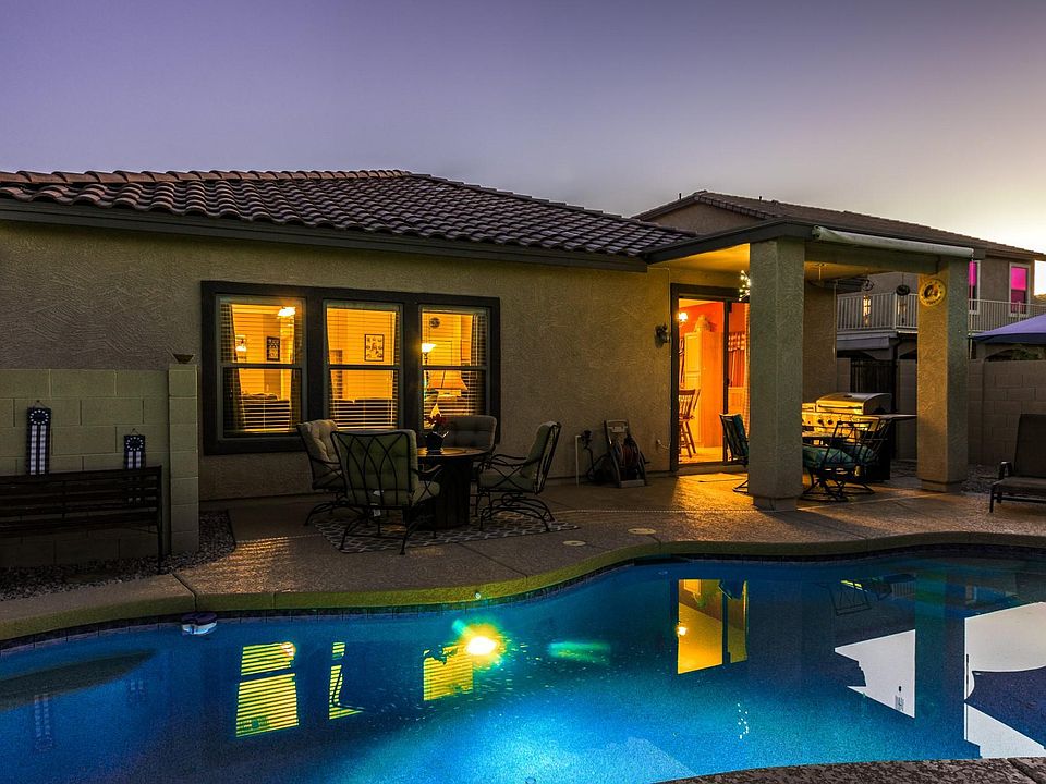 Cared for as a second home, see finishes list, too much to list! Tile in all of the right places and designer color pallet through out. Perfect for your personal touch. The GREAT ROOM opens living areato the kitchen with wood cabinets, GRANITE (updated pictures to come)counter tops offer the perfect amount of counter space, black appliances, kitchen island, and breakfast bar. Generous master bedroom has a spacious master bathroom with a stand-alone tub, walk-in shower, and double sinks! Enjoy the Arizona weather in the backyard under the covered patio or cool off in the $78,000.00 resort style pool and professionally landscaped front and rear grounds! Double gates lead to a metal storage shed conveys with property. R/O and water softener conveys. Don't miss out on your dream home!