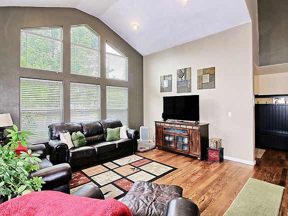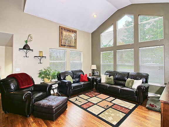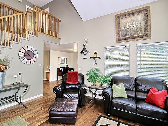 Love this floor plan! A roomy foyer with enough space to sit down and take off your shoes, hang up your coat, and then make your way into a grand living room, floor to ceiling widows flow way up to the vaulted ceiling, warm new paint colors blend so well with the real hardwood floors. The kitchen design is so appealing with wide counters, almond cabinets and a nice big window to peek out back. All appliances stay. The master suite sits right off the dining room and feels private. Plenty of space for a sitting area or desk, the master bath has a double sink and cute shelves for storage. 3 more bedrooms upstairs, each large enough to hold a king size bed, with plenty of closet space. Another full bath upstairs and the laundry room with storage. Squeaky clean home! 2 car attached garage, storage unit stays, completely landscaped with garden area. Friendly Wilson Ranch Neighborhood.