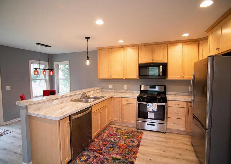 No need for any updates, they've already all been done! This incredible Maplewood rambler was completely renovated from top to bottom in 2017. Everything is NEW! This home has a new roof, new windows, new siding, new furnace and AC, new water heater, new air exchanger and also features a stunning brand new kitchen with a dining room addition and breakfast bar, it also has maple cabinets, plenty of counter space and stainless steel appliances, a beautiful barn wood feature wall in the living room, 3 bedrooms on the main level with a 4th bedroom in the lower level, the lower level also has a HUGE family room and an additional den/office space. All this is nestled on a large lot which backs up to beautiful woods and is next to a vacant lot. It's close to the bus line, shopping and restaurants! This home offers everything you could ask for!