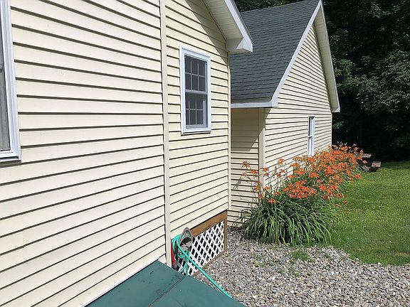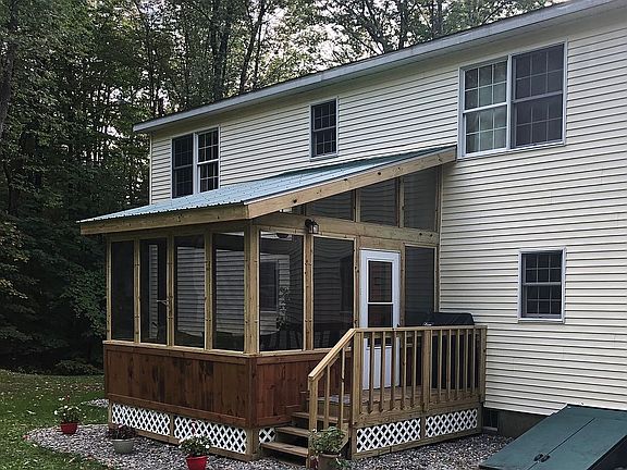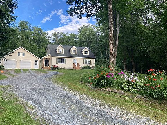 Located 10 miles from Jay Peak Ski Resort/Golf Course/Waterpark on a quiet country road with a private setting and beautiful sunset views. This Saltbox Cape offers large rooms and an open floor plan. There are beautiful hickory hardwood floors on the main level of the home. There is an eat in kitchen and dining room with breakfast bar and stainless steel appliances, including a double wall oven. A relaxing 3 season room off of the dining room provides views of the wildlife and is the perfect place to relax. The master bedroom is located on the main level with the master bath offering a large soaking tub and walk in shower stall. The second level features 3 bedrooms with 1 bedroom opening into and extra room/office. The full unfinished, completely insulated basement allows for plenty of storage or the ability to add on more rooms. There is baseboard heat throughout the house and a pellet stove in the basement which also can heat the whole house with the venting which is connected. The efficient hybrid heat pump water heater keeps water hot with minimal cost while dehumidifying the basement. The mudroom has ample amount of storage with a closet containing hickory cabinets and space for shoes and coats. The 26'x26' garage is large enough for 2 cars and work space. Enjoy summer nights by the stone fire pit while listening to the adjacent stream.