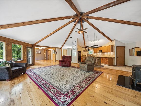 UPDATES ARE COMPLETE! Amazing, spacious Ranch Home on 5+ acres, minutes from Hwy 44 @ the Pacific Exit, this home will check all your boxes & keep you close to the StL attractions while tucked into the Pacific community! Beautiful custom-milled Hickory floors from the acreage & Cathedral Ceilings will impress. The view from the fabulous Great Room & Dining Room is unbelievable! Spacious Kitchen. Main-floor Master BR Suite & the 2nd BR are spacious. The Family Room & two more sizeable bedrooms plus a stunning bathroom finish off the Walkout Lower-Level that leads to a level yard for your enjoyment. The wrap-around deck with built-in seating is perfect for having guests or watching wildlife. The private, circle driveway makes having guests easy. New carpet in all 4 bedrooms & office converted to a bedroom! Roof - 2013; replaced a/c coil & motherboard in furnace; replaced well pump, motor and bellows tank and more!
