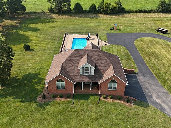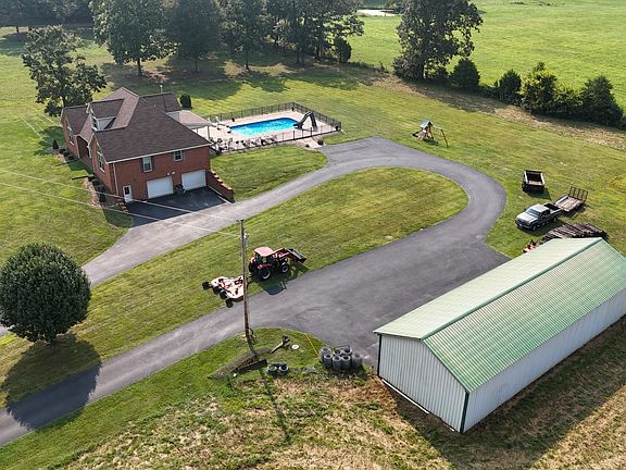 AT ABSOLUTE AUCTION - SATURDAY SEPTEMBER 27TH AT 10:00 A.M.! 1-owner custom built 1-1/2 story brick house that was built in 1998. This beautiful home boasts over 4,000 sq. ft. of heated and cooled living space! The main floor has a spacious living room with 14' vaulted ceiling, kitchen/dining with an abundance of oak cabinets, granite counter tops, snack bar, tile backsplash and stainless steel appliances, primary bedroom with vaulted ceiling, double vanity, separate shower, whirlpool tub and walk-in closet with custom closet organizer. The main floor features 2 additional bedrooms, 1-full bath and has 9' ceiling throughout. The second floor has an additional 2-bedrooms, full bathroom, office and lots of extra storage space! The full basement is partially finished with a living room area, kitchen complete w/appliances, full bathroom and walk-in closet! An excellent in-law apartment or rec room space!! The basement also has a 2-car garage area and storm shelter!! Come enjoy the 12×24 covered patio that leads to a stunning 18×36 inground pool with an extra wide slate design concrete walking surface and pool slide! Recent improvements over the last 3-years include a new roof, central heat/air and replacement windows! There is also a 30×70 implement shed, blacktop drive and more on a gorgeous 6.33 acres! This beautiful home has been well maintained and is move-in ready! A place anyone would be proud to call home!!