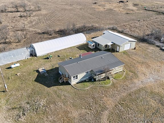 Enjoy peaceful country living on 5.17 acres just minutes from the lake. This well maintained home offers 3 bedrooms, 2 baths, and an oversized living area with built in shelving and a wood burning fireplace. The bright eat in kitchen features abundant cabinetry, a pantry, and excellent natural light. The primary suite includes a private bath with soaking tub and separate shower. A sunroom provides the perfect spot to relax and enjoy the surrounding views. The property is well equipped with a large shop featuring concrete floors, heat and air, and additional rooms. Also included is a greenhouse with all equipment, shed, storm cellar, 400 amp electric service, and private well with enough GPM that it supplied the house and entire green house. Located only 1.5 miles from a boat ramp with excellent fishing and with convenient access to Hwy 169 to Oologah, Bartlesville, and Owasso. Ideal for those seeking space, functionality, and a rural lifestyle without being far from town.