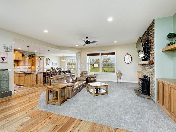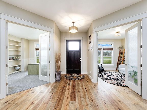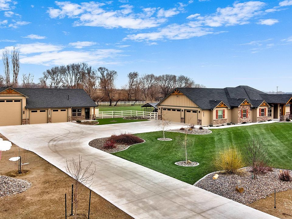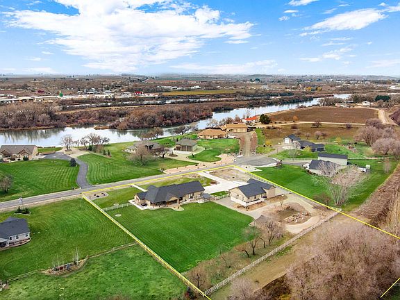 Experience country living just a stone's throw from the Snake River, surrounded by breathtaking views of the Owyhee Mountains and in the middle of Idaho Wine Country! This meticulously maintained 2.84-acre property boasts a beautiful single-level home with separate living quarters, and the subdivision permits animals. The main home offers an open living space, 3 beds, 2.5 baths, den and separate office, a stunning kitchen with fine finishes, including a wine fridge; luxurious features like a primary bedroom with a walk-in closet, spacious walk-in shower, heated tile floors, and a soaker tub. The separate living quarters include one bed, office space, one bath, and an open living area, making it an ideal space for parents/rental. Additionally, there's a separate garage with a 48' RV bay, 2x 220V, epoxy floors, cabinets, water, heat, and more. Step outside and enjoy the large covered patio area surrounded by a well-kept yard, fenced-in garden area, fruit trees, and the beauty of nature and wildlife all around.