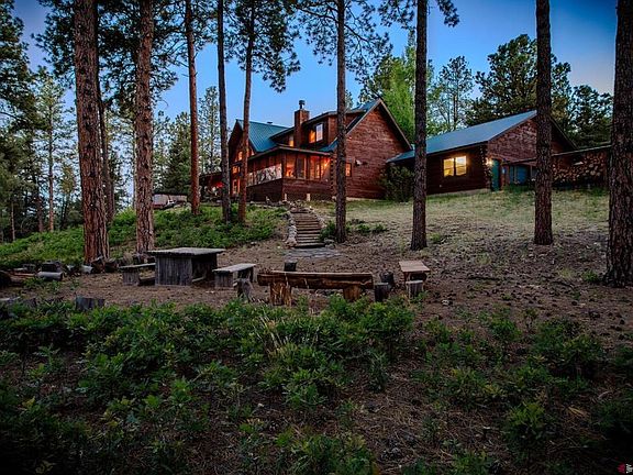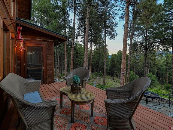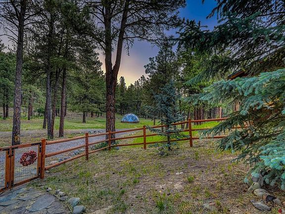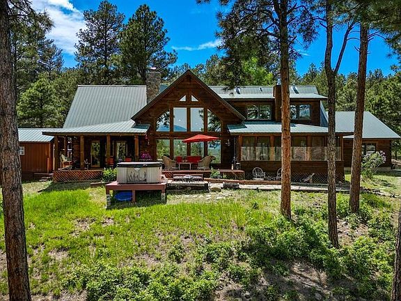 Colorado Dream Ranch retreat. Only minutes from historic Old Town Pagosa Springs and hiding in this majestic tall pine forest overlooking miles of alpine mountain landscapes, countless pines and then panoramic views of the massive San Juan Mountain peaks nearby. Pure Colorado goodness . Journey up this non-descript drive and you'll feel the embrace of old growth forestation as you gently ascend up to the meadowy perch of this very special retreat. This home and setting are picture perfect. Nestled in the back corner of this spacious 38 acre holding is a wonderfully crafted retreat built of hearty logs which were milled to provide for it's rugged mountain look and feel. From the circular drive you'll meander through the gate and up the stone walkway to a covered entry deck. Once inside you'll instantly recognize the embrace of a finely crafted masterpiece offering towering ceilings, masculine log accents, loads of warm woods, a massive moss rock fireplace climbing from floor to ceiling with a natural log mantle unlike anything you've seen before. The open concept floor plan just draws you in and the endless upgrades are evident in every direction. Walk further into the room and you'll be spellbound by the extraordinary mountain views which, by design, fill the floor to ceiling bank of glass across the full east side of the living room, towering over miles of majestic tall pines and natural meadows. You'll love the spacious kitchen, extra windows, custom cabinetry and, of course, that Wolf stove you've been dreaming of. A sliding glass door lures you into a wonderful screened porch with yet another natural rock wood fireplace. Oh the books you'll read and naps you'll take here. Step beyond to the back deck and enjoy the wind whispering through the trees and the sweet tranquility of this amazing setting. Down the steps to the left and you'll see a wonderful fire pit for friendly gatherings and endless tales of your Pagosa four season adventures. To the right you'll find a hot tub in which to survey the mind-numbing display of stars above the peaks in the night skies. OK, back inside you'll find a beautiful ground level master bedroom suite with a unique open loft office above which is accessible only from the second story. Laundry room, pantry and three car garage also reside on the main level so stair use is required only when company arrives. Journey up and you'll find two additional bedrooms with their own cozy fireplaces and a full bathroom. There is also a clever reading nook under a large window overlooking the forest. The open loft upstairs is a great gathering place and it has it's own private covered deck. Now, back to a few more extras you'll not want to miss: The meadow in front of the home has a large growing dome for the gardening enthusiast (with water and electric) plus a large equipment shed to the north of the home for tractor, gear and wrenching. The front yard is fully fenced for your pets and there is a sweet Amish built detached bonus room on the south side of the home for games, hobbies, camping or for the kids and grandkids to enjoy. Why build, the heavy lifting has all been done here. This offering is exceptional in every way. Minutes from old town, private entry gate, opportunity for a pond, city water, paved roads to the entry and, believe it or not, most of the personal property is available with the home...plus charm the size of Texas. Don't miss out on this rare stunner. Truly, you've got to experience it to fully appreciate all it has to offer. We'll hope to see you soon.