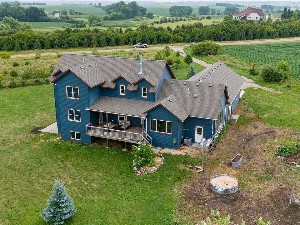 This is your dream come true, beautiful newer home with 24 ft ceilings in the living room. The kitchen has a huge eat in soapstone island and area for formal dining. This home has an indoor greenhouse that is perfect for growing year around. It also features a huge pantry, main floor master with dual walk-in closets, waterfall shower and soaker tub. Conveniently located main floor laundry. 3 bedrooms upstairs and 1 downstairs with a 6th bedroom inspected and ready for sheetrock. Huge mechanical room could be a perfect movie room. The lower level has walkout to the playground set that stays! The oversized double garage is insulated and has 220 amp, and 3rd stall converted shop area is perfect for art studio or wood shop. It is also plumbed for a dog washing basin. Outside there is a heated chicken coup and a 500 gal underground cistern that collected rain water for gardening. This home is on rural water. Both front porch and back deck are covered for evenings enjoying the sunset in your private oasis. Target is a quick 10 minutes away and the apple orchard is just up the street! This home is being sold with 4 additional acres listed for $130,000.