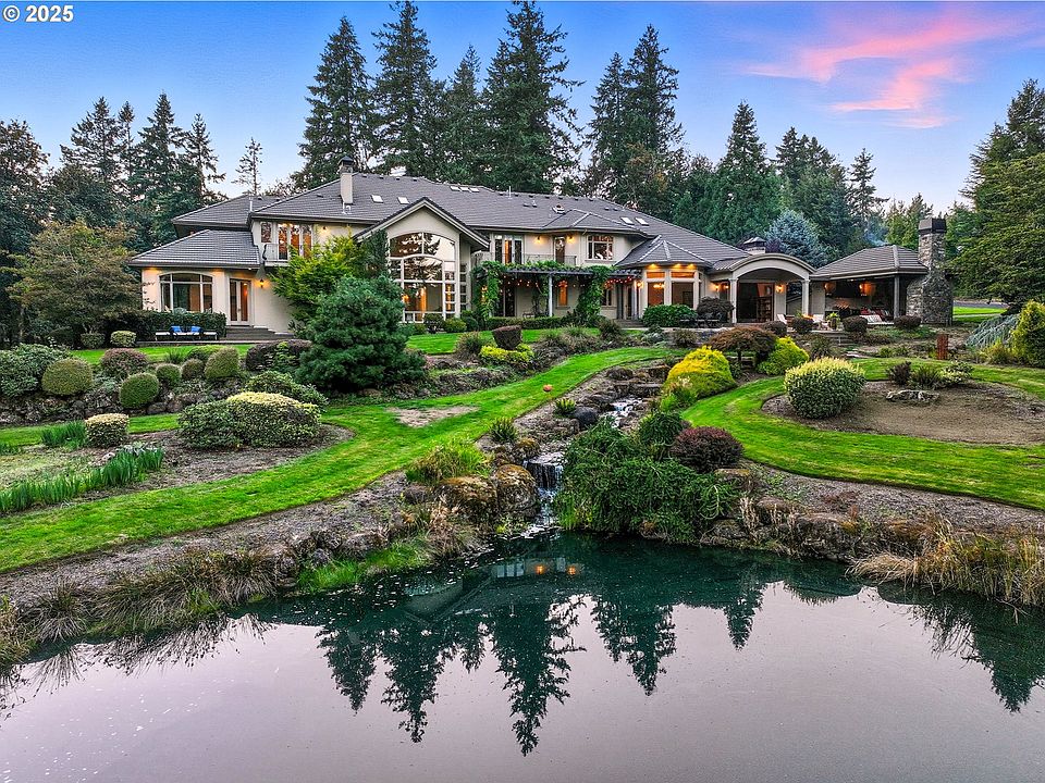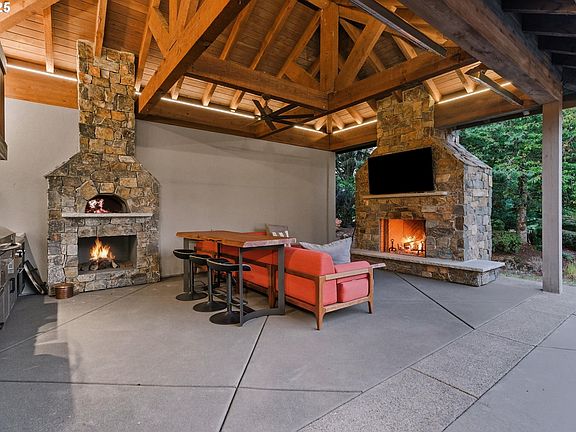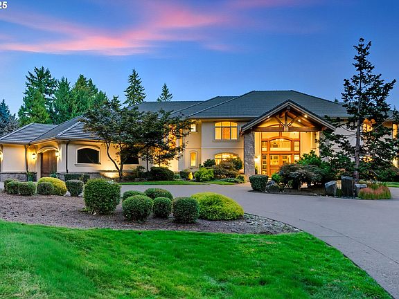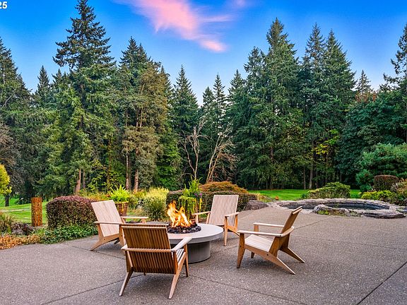 Perched on the 18th hole of the iconic Oregon Golf Club, this West Linn estate offers a rare combination of timeless architecture, modern innovation, and resort-style amenities with main level living. Ownership includes a coveted Oregon Golf Club membership, granting access to championship golf, fine dining, and exclusive lifestyle experiences just steps away. Enter through the gated country club entrance and follow a private lane winding through nature to your spectacular 19-acre homestead. Catch your breath as you step through the 10 foot tall double door entry to behold a dramatic grand staircase and vaulted, wood-clad ceilings setting the tone for light-filled, elegant living spaces. The great room and dining areas flow seamlessly to the outdoors, featuring a covered, heated terrace with fireplace and outdoor kitchen — complete with a wood-burning pizza oven for year-round enjoyment. Expansive windows frame views of the course, serene ponds, and meticulously landscaped grounds enhanced by intricate water features. At the heart of the home, a chef’s kitchen anchors the main level, showcasing an oversized island, Wolf gas range, pristine stone surfaces, and high-end appliances. All bedrooms are en-suite for ultimate comfort, while the main level private primary wing offers a spa-inspired bath and custom dressing room. Entertainment abounds with a theater room complete with sound system, an upper-level pool/game/media room, and multiple terraces for gatherings. A detached 2,600+ sq ft workshop provides space for car enthusiasts, recreational vehicles, creative studios, shop, etc. Modern updates include a customizable zoned HVAC system and new Lutron lighting for effortless control throughout. This estate captures the essence of Northwest luxury living — a perfect balance of privacy, sophistication, and unrivaled access to the Oregon Golf Club, old town Willamette in West Linn, freeways, and top schools with the option to attend the new Riverside High School with IB
