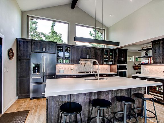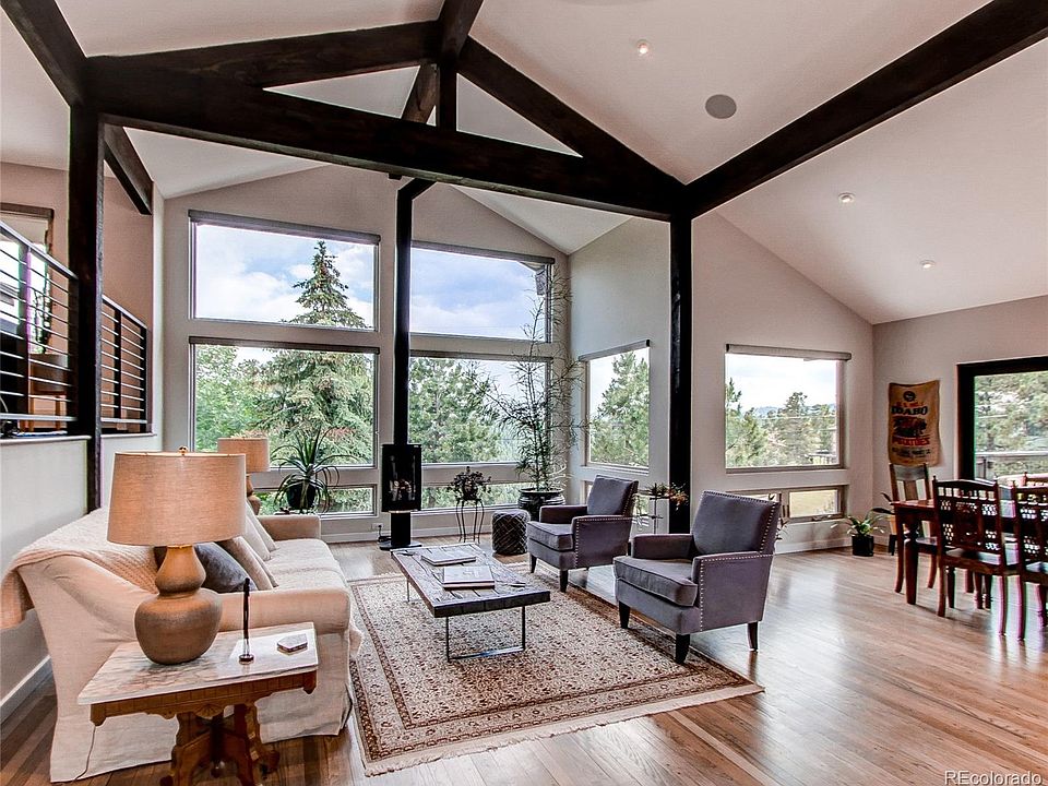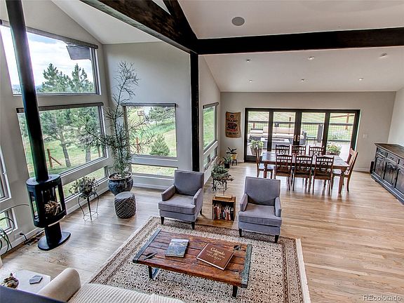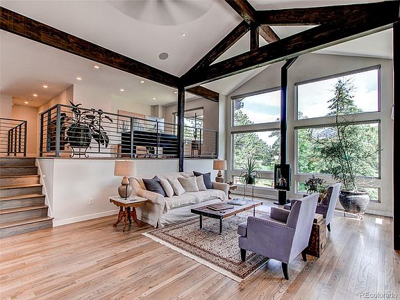 Impressive MOUNTAIN MODERN home with Open Plan tastefully updated and seamlessly executed from top to bottom in 2017 & 2019 offers Colorado Front Range living at it's finest. The Great room with Jotul gas fireplace, wood floors and wall of windows cascading natural light opens to custom Kitchen with quartz counters, beverage cooler, warming drawer, 5 burner gas cook-top with pot filler & heated wood floor. The large Dining room with indoor/out massive glass doors opens to deck with expansive VIEWS of the Enchanted Forest and the Apex Trail. Walk-in Pantry and half Bath complete the Main level. The Upper level features a large Office w/hardwood floors and views, the luxurious Master Suite w/private deck, walk-in closet w/custom built-ins, Master Bath w/electric floor heat w/thermostat control and double shower with pebble floor. The Lower level features a 2nd en-suite/guest suite and shower w/pebble floor & private patio, a 3rd Bedroom, stunning full Bathroom, large Laundry room with sink and abundant built-ins and the Mechanical room. Walk-out Family Room and walk-out Storage room in the lowest level offers access to the therapeutic spa/hot tub and to the patio area. Life time Gerard stone coated steel roof, hardwood flooring throughout, custom metal railings, unique custom lighting, designer colors and ambiance, over sized garage with storage, fenced dog yard, gas fire pit featured on large Trex deck w/gas BBQ, container gardens w/drip line, indoor/outdoor speakers. All levels have walk-out access, the 1.15 acres goes beyond the fenced dog yard area, circular drive and parking pad for additional off street parking. This unique home nestled in these magical and accessible Foothills is move-in ready, immaculate and only 20 minutes to Denver, 45 minutes to DIA and a close 30 minutes to world class skiing. Play, hike and bike in your own back yard on over 500 acres on the Apex Trail, observe entertaining wild life and enjoy your own vacation paradise every day.