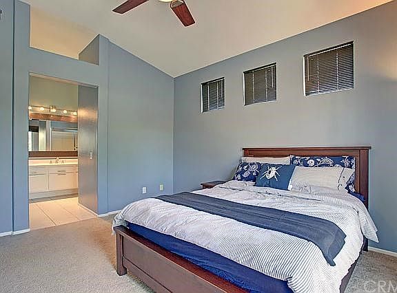This open and upgraded unit is move-in ready! Large-cut tile flooring, designer inspired paint, soaring ceilings, light-catching windows, cozy fireplace, and recessed lighting superbly complement the well-appointed kitchen with wood flooring, ceramic tile counter tops, recessed lighting, Bosch appliances and range, light wood cabinets, and breakfast bar. The adjacent eating area seamlessly connects with the kitchen and living room, and has direct access to an expansive balcony with mountain and tree views. Enjoy the serenity of the spacious master suite with high ceilings, sizable walk-in closet, and bathroom with single lighted vanity and shower/tub combo. The spacious secondary bedroom has a cooling ceiling fan, raised ceilings, plush carpet, generous dual closets, and an attached full bathroom. There is an attached one-car garage with direct access to the home and laundry hook ups. Community pool and lovely Lake Mission Viejo access!