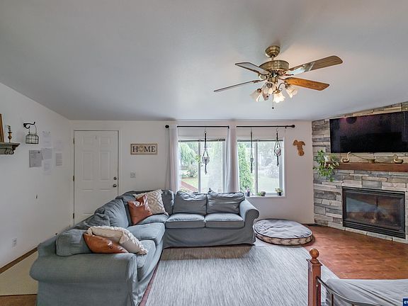 Well maintained single level home on 1.19 Acres! Updates including LVP floors, almost-new gas furnace with central AC, newer composition roof, newer exterior paint, gas fireplace with stone surround, skylights, and large bath tubs in both bathrooms. Floor plan is open with vaulted ceilings, 4 bedrooms, a primary suite with walk-in closet, and a dedicated office. The detached shop has room for 4 cars plus storage and features 3 overhead doors - two at 10'x10' in size. The entire property is flat and usable.