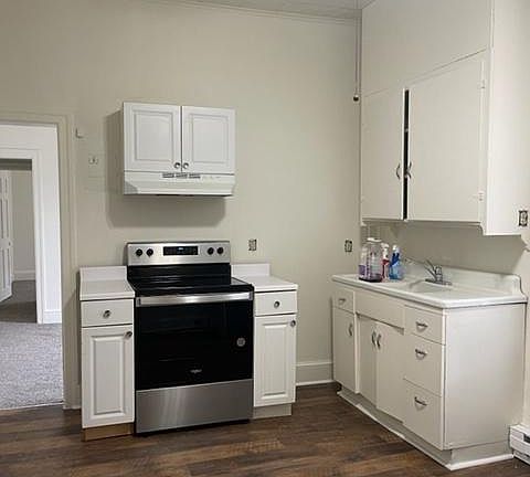 Freshly painted 1 bedroom and 1 bath apartment located in quiet building on East Main Street convenient to downtown Westminster area to all shops, restaurants, pubs, etc. This apartment feels open and inviting with very high ceilings throughout. Old meets new with the original cabinetry in kitchen, ceramic sink, some newer white cabinets and farm-style luxury plank flooring. Eat-in kitchen includes new stainless steel range and refrigerator, ceiling fan and pantry closet. Nice full bath with a window allowing lots of natural sunlight. - new plank flooring, toilet and vanity. Living room and bedroom are the perfect size for one person. Bonus storage higher up in cabinets that are floor to ceiling in bedroom. New carpet in living and bedrooms. Blinds have been installed throughout and Owner includes one window A/C unit. This apartment is perfect for someone who is a minimalist and doesn't have big furniture, etc. Coin-operated laundry in basement with folding table. Off street parking. All exterior entry doors are keyed entry for all tenants. $1,150.00 per month $1,150.00 security deposit Application fee is required. 18-month lease is required. NO SMOKING?/Owner may allow one (1) cat with good references and additional pet deposit. Owner includes water, sewer, heat to hot water and trash. Tenant pays BGE and must have Renter's Insurance. NO SMOKING/NO DOGS PLEASE! Coin-operated laundry located in lower level of building. Off street parking is available. 18-month lease is required. Application fee is required.