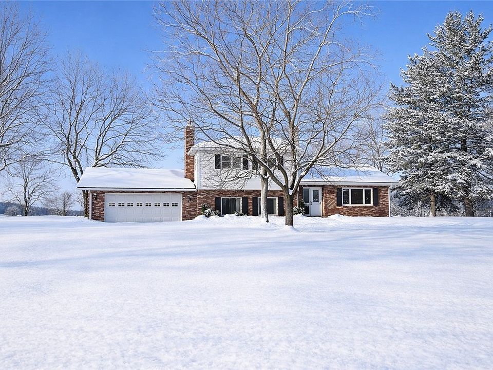 Bring your family, your animals, and your dreams! On 10.39 acres +/- with agricultural zoning and picturesque views…..how long have you been looking for a place JUST like this?! Country living meets comfort in the 3 BR 2 BA tri-level residence, a one-owner home that has been lovingly maintained and thoughtfully updated throughout its 46 years. Step inside to a light-filled living room, where freshly installed carpet invites you to kick off your shoes and settle in. The room’s openness flows into a sizeable kitchen and dining area, where a center island with cooktop is at the hub. A window over the sink frames peaceful countryside views, while the dining space looks out over rolling fields where sunsets are the evening entertainment. The favorite spot for all who gather here is sure to be the expansive family room—a warm, mid-century inspired retreat where a full-wall brick fireplace with woodstove insert meets soaring beamed ceilings.