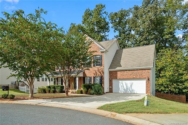 This gorgeous property, located in a swim & tennis community, welcomes you home with a large front porch & private backyard with picturesque views. Main level details include fireplace, hardwood flooring, crown molding, wainscotting, recessed spotlights & new wooden plantation shutters. Formal dining room, eat-in kitchen with an island, granite counter tops, pantry & under cabinet lighting! Kitchen & sun room open onto a large deck overlooking a small stream! Beautiful master suite boasts a walk-in closet, tray ceiling, and a LUXURY bath that includes a fully tiled walk-in shower with frame-less glass doors, garden tub with a waterfall faucet, vessel vanity sinks & custom cabinets. Ancillary bedroom features a beechwood library wall. All new carpet! Pet friendly, sports-grade artificial turf in the rear of the fenced back yard. Storage everywhere, including upstairs hall closet, oversized garage & attic. Irrigation system. Cul-de-sac lot, minutes from Charlotte! All appliances remain.