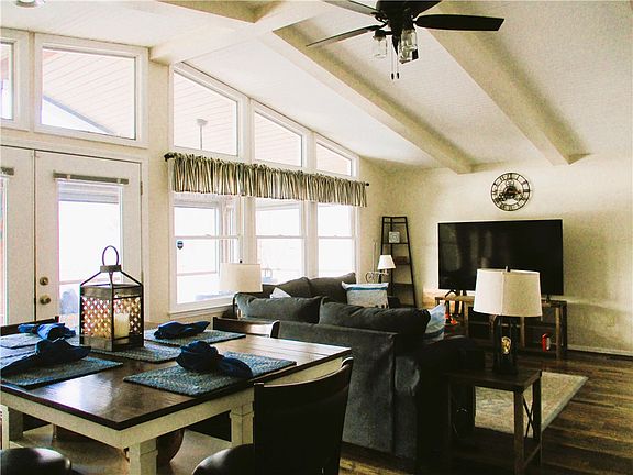 The property also boasts a fire pit, adding a touch of warmth and charm to evenings spent under the starlit sky. Moreover, being above the flood zone line provides added peace of mind. This home includes all furniture and appliances in the sales price, ensuring a turnkey experience for the new owners. Additionally, the negotiable pontoon boat presents an opportunity for seamless lake enjoyment.