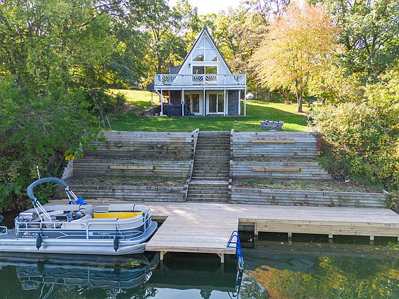 Premier lake front lot with very minimal steps to the water plus a completely updated and modernized 3-4 bedroom home! This home recently underwent an extremely extensive remodel including all new electrical, plumbing, furnace, water heater, central air, paint, flooring, new bathrooms, siding, stone work, windows, roof, kitchen, appliances, all doors, spray foam insulation and more. Beautiful kitchen with Kraftmaid cabinets, granite counter tops and all appliances but the star of the show here is the massive walk in pantry! Two full bathrooms with tile showers and one with a marble counter. Lower walkout level with 3 bedrooms, bonus room and full bath with laundry plus access to the ground level patio that has hookups in place for a hot tub off of the master if desired. Loft bedroom on the upper level. 200 amp electrical service. 22' x 30' heated garage was built new in 2020 and features spray foam insulation and a finished 14' x 30' room above with it's own heating and cooling plus a 12' x 16' 2nd story deck attached. Additional 10' x 30' boat shed was new in 2020 and has that extra storage for all of your needs. 60' of water frontage with 56' long dock was completely rebuilt in 2022 with space for up to 3 boats, large decking area and minimal stairs to get to the water. Home also has all electrical in place in case the new owner wants to add a generator.