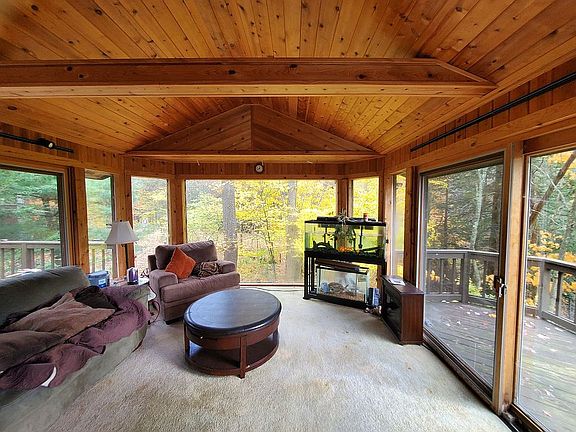 A HOME FOR ALL SEASONS! OWNER IS PROVIDING $35K CREDIT FOR UPDATES!! You'll love coming home to this 3BR, 2BA, full finished basement with a pond, open concept on wooded 11+/- acres in the Poconos! Master suite on top floor. A spacious living room with cedar walls and ceilings, large windows allowing for natural sunlight and stone fireplace is perfect to warm you in the winter nights! Walk-out onto the wood deck, set up a gazebo and make it a great time for entertaining and grilling for family & friends. Perfectly secluded! Great views of the pond from the sun room. Abundance of wildlife to enjoy from the panoramic atrium view. There is an additional building on property. Bring your imagination!Zoned commercial! Surrounded by conservation & game lands. 2021-03-25