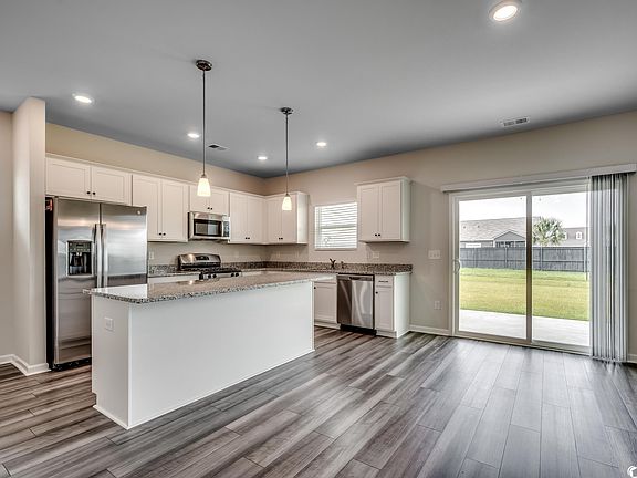 Welcome home to the Russell! Complete with a covered back porch to enjoy your large private backyard. Your new home is move in ready. This two-story home features four bedrooms all with walk in closets, and a convenient flex space downstairs for that extra space you need. The kitchen comes equipped with white cabinets, granite countertops and GE stainless steel appliances including gas range & refrigerator. Luxury vinyl plank flooring runs throughout the open concept kitchen, eat-in area and great room and wet areas. Upstairs, the primary bedroom features 2 walk-in closets and en suite bathroom featuring a raised vanity with dual sinks, quartz countertop and linen closet. Rounding out the upstairs are 3 additional bedrooms, a conveniently located laundry room (includes washer/dryer) & a large loft. Window blinds installed for you! Come see your new home at Merrill Villas! Located in Carolina Forest – one of the most popular communities in the area, with an award winning school district – just west side of the Intracoastal Waterway. Close to Carolina Forest but without the Traffic! This natural gas community gives you easy access to the Myrtle Beach Airport and HWY 31 allowing you easy access to Myrtle Beach, Conway, North Myrtle Beach and the rest of the Grand Strand.