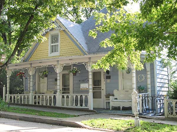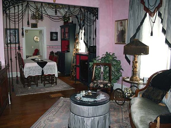 The possibilities are endless with this Spring Street charmer that doubles as a well-known tourist lodging establishment, Chantilly Lace, and as a romantic getaway for its owners. You could have the pick of any three beautiful suites when you come to town or keep one for yourself and generate income from the other two. Decorated in high Victorian style with an eclectic parlor and adjoining dining room lit by an antique chandelier. Custom cabinets conceal a small refrigerator and microwave while providing chic storage space for glassware and other wet bar essentials. The main floor bedroom offers a queen bed with a chandelier overhead. The adjoining bath has a cottage feel with its wainscoted walls and an oversized claw foot tub/shower. The upstairs has a large bedroom and full bath that enable it to accommodate several couples or small groups. Two full beds and a twin bed are tucked into dormers and are surrounded by a beautiful one-of-a-kind mural inspired by the Victorian homes and gardens in the surrounding Spring Street neighborhood. The parlor in the second guest suite on the main floor, is Victorian in style with a beautiful wallpaper border of draped floral fabric under the crown molding. The adjoining bedroom has a queen bed. The bath has a large Jacuzzi tub/shower and a pedestal sink. Guests will enjoy relaxing on the backed screen porch overlooking a wooded ravine Suite on the lower level has a cozy TV/sun room, kitchen and dining room, bedroom and bath. The sunroom is cheerful with two walls of windows. The bedroom is spacious with a sitting area and a corner Jacuzzi tub that overlooks the back yard. French doors in the sunroom and bedroom open onto a private screened porch. The home’s basement has a private side entrance and has dishwasher, washer/dryer connections, large laundry table, laundry sink and built-in storage. There’s also a handyman’s corner with another large workbench and pegboard wall for tools. Some furnishings are included in the sale. HUGE BONUS that was overlooked at initial listing and appraisal. Home comes with a second 40x80 lot behind the main home with private 3 car parking and room to grow or add a cottage or garage apartment. Look at the others, then look at the parking available, and you will see why this stands apart from the rest. Home also has several lots of space on both sides that belong to the neighbors, but also means you aren't wedged in between homes. Less noise and room to breath.