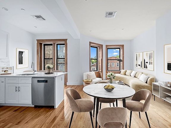 Welcome to 257 Throop Ave, a charming condo nestled within a classic Brooklyn limestone. This beautifully renovated residence offers a perfect blend of historic charm and modern convenience, sprawling across 1,154 square feet. With three bedrooms and two bathrooms, this home is designed to provide comfort and style.