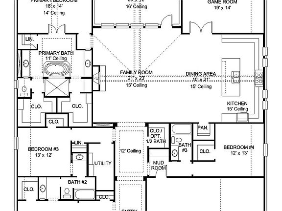 Home office with French doors set at entry with 12-foot ceiling and wood floors. Extended entry leads to open family room, dining area and kitchen with 16-foot ceilings throughout. Family room features fireplace and sliding glass door. Kitchen features walk-in pantry, built-in double wall oven, 5-burner gas cooktop, generous counter space and oversized island with built-in seating space. Game room with wall of windows just off dining area. Primary suite includes bedroom with wall of windows. Primary bath features 11-foot ceiling, dual vanities, freestanding tub, separate glass-enclosed shower and two walk-in closets. A Hollywood bath adds to this spacious four-bedroom home. Extended covered backyard patio with 16-foot ceiling. Mud room off three car-garage.