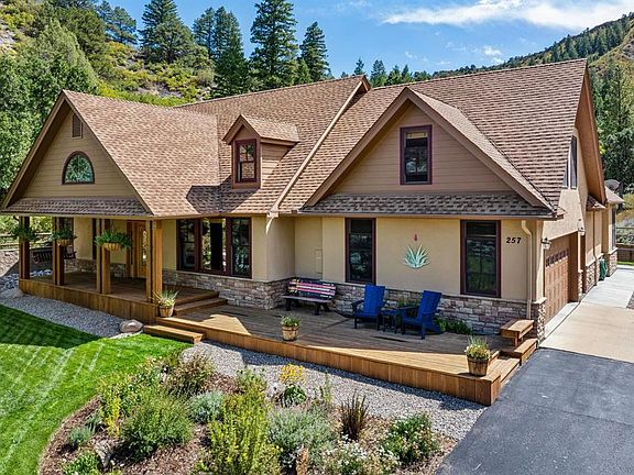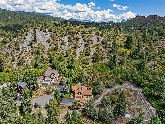 Welcome to this meticulously maintained and thoughtfully upgraded residence tucked at the end of a quiet cul-de-sac with breathtaking La Plata Mountain and private box canyon views. Beautifully cared for by the same owners for 14 years, this custom home offers 2,687 square feet of living space with three bedrooms, two and a half bathrooms, and a spacious family room. Situated on a premium 0.531-acre lot, the property combines privacy, mountain views, and carefully designed outdoor living. The interior features new French oak 30-year floors, fresh paint throughout, and abundant natural light from high-quality wood-clad double-pane windows and sliding glass doors. The spacious living and dining rooms showcase vaulted ceilings, a decorative gas fireplace, gallery-quality LED lighting, and seamless flow to the kitchen. The chef’s kitchen is equipped with stainless steel appliances, including a gas range with double oven, granite countertops with bar seating, a pantry, under-sink reverse-osmosis, recessed and under-cabinet lighting, and a custom-built-in breakfast nook filled with morning sun. The main-level primary suite offers vaulted ceilings, a walk-in closet, and private deck access to the hot tub. The en suite bath includes a double vanity with granite counters, a jetted tub with granite surrounds, and a Thermasol steam shower with a built-in bench. Two additional bedrooms, one currently serving as a private office, along with a powder room, guest bath, and well-designed laundry room with new flooring, solar tube, folding space, and abundant storage, provide comfort and functionality. Upstairs, a versatile bonus room features a custom beetle-kill pine accent wall, media wiring with surround sound, dedicated storage closets, and sweeping mountain and canyon views. A detached outbuilding adds another 324 square feet and is currently finished as a gym and spin studio with rubber flooring, a programmable heater, and large windows for natural light. This bonus space provides flexibility for fitness, hobbies, or a workshop. This home is designed with efficiency and comfort in mind. Systems include ducted forced-air natural gas heat, an Aprilaire whole-house humidifier, a high-efficiency 79-gallon water heater, and a 7,500-watt roof-mounted solar array with an inverter. Additional upgrades include new exterior paint, custom decks with covered portions, indoor and outdoor speakers wired to a central media system, and expert landscaping with irrigation. Outdoor living is exceptional. The fenced yard and ranch-style front fencing create privacy, while multiple custom redwood decks invite gatherings and quiet moments alike. Enjoy the built-in natural gas firepit, café lighting, outdoor speakers, porch swing, built-in seating and planters, and a Sundance Marin 880 spa. The mature trees, manicured turf and landscaped beds, tasteful retaining walls, and stone stairways blend seamlessly with natural spaces beyond. A secure, fenced backyard provides the perfect space for dogs to play and roam. Wildlife viewing and stargazing in the box canyon enhance the sense of mountain living. The oversized attached two-car garage includes abundant overhead storage, built-in locking aluminum shop cabinets, a workbench, and an adjoining mechanical room with crawl space access. Significant paved parking plus a gravel pad offer plenty of space for additional vehicles, a boat, or an RV. Combining privacy, efficiency, and modern upgrades with stunning views, this home is a true Durango treasure just minutes from downtown. Don’t miss the opportunity to experience Durango living at its finest - schedule your private showing today.