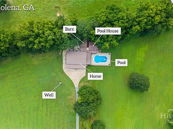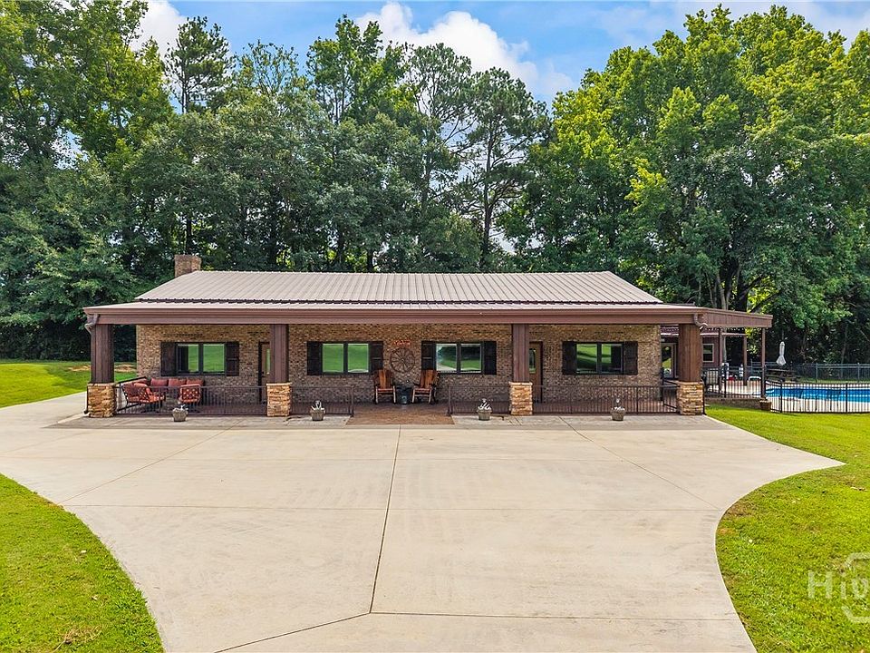 Stunning 2-bedroom, 1.5-bath custom barndominium situated on 5 acres in the quiet countryside of Pike County. his well-appointed home offers 1,150 sq.ft. of thoughtfully designed living room space, featuring high ceilings and engineered hardwood flooring throughout. The spacious great room includes a large gas fireplace and four custom built-ins, flowing seamlessly into a massive eat-in kitchen equipped with custom cabinetry, soft-close drawers and doors, chiseled-edge granite countertops, stainless steel appliances, a farm sink, and a large dining area with a built-in hutch. Triple-pane Pella windows with built-in blinds fill the home with natural light while enhancing energy efficiency. Enjoy year-round comfort with dual 13 SEER Ruud heat pumps. The bathroom includes a luxurious large tile walk-in shower and a jetted tub for spa-like relaxation. Built with low-maintenance brick and topped with a durable metal roof, the home also features over 1,500 sq.ft. of covered porches that overlook 15+ acres of open land. The property boasts approximately 800 feet of road frontage and includes a 24' x 40' saltwater pool and a 576 sq.ft. pool house/in-law suite for guests or extended family. A spacious garage and a separate barn provide ample storage for equipment or recreational use.