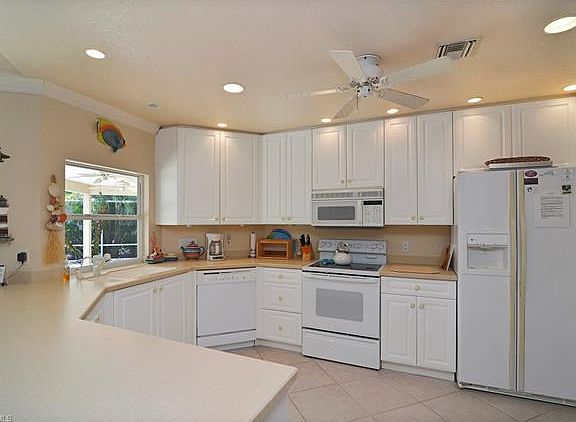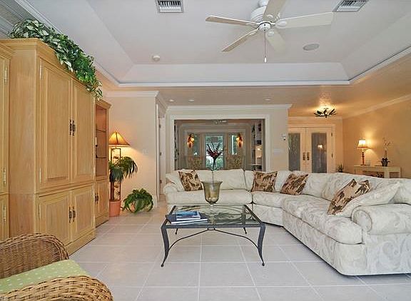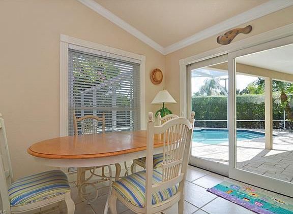 Corner lot located in the desirable Moorings neighborhood on a beautiful tree-lined street, just under 1 mile to beach. Open and airy floor plan, with views opening onto screened travertine deck and heated pool area. Spacious backyard landscaped for privacy. Cozy outdoor dining (table with 6 chairs and loungers for relaxing). Surround sound throughout home and pool area. Bedrooms offer a King in the Master, Queen in the second and Twins in the third. Internet, WiFi and printer. Family room with large flat screen TV and living area also with TV. Situated close to beach, shopping, restaurants and entertainment. For those who enjoy walking, running or bicycling (4 bikes provided), this location is perfect. Owner provides parking pass to the private Moorings Beach. Information contained herein deemed reliable but not guaranteed