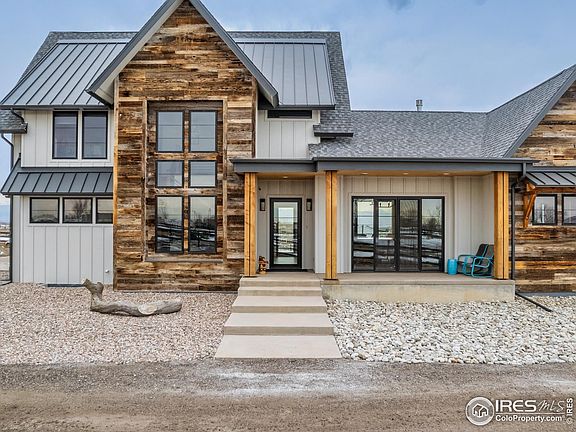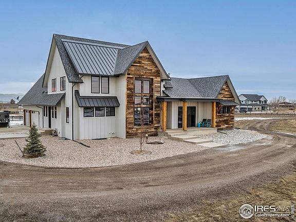 This modern farmhouse style custom home built in 2019 sits on 3.2 fenced acres enjoying wide open views towards the Rockies. Built to a high spec, there are 5 bedrooms and 4.5 bathrooms and an oversized 3 car garage. The main floor with wooden floors is open plan with a 14' sliding glass door that opens to the large covered patio area.A great house for entertaining with a split level island in the kitchen that has a clean contemporary look with high end stainless appliances.The primary suite has views to the west and a luxurious en suite bathroom with soaking tub. Three bedrooms and an office space are on the upper level. The lower level has a bright 5th / guest bedroom with ensuite shower, and a large rec area with wet bar. The 3,2 acres offer loads of opportunity to expand with out buildings or even a guest suite.Easy access to Boulder, Denver, DIA, and downtown Erie is just a few minutes drive away. The opportunites this home presents are endless!!