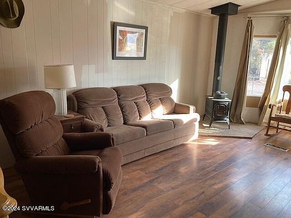 This end-of-the-road setting boasts serenity and seclusion and is in close proximity to the serenity of the Verde River. The entire parcel, .582 acres, is securely fenced. A sprinkler system caters to a portion of the lot. There are two versatile sheds and a charming gazebo. This well-fed property has a pump house with a pressure tank. The mobile home residence features two bedrooms, two baths, and an unheated office/sleeping space. Double-pane windows have been added. Pergo flooring has been installed. The attached garage effortlessly accommodates up to three cars. A well-appointed workshop and a convenient laundry room with a washer and dryer are off the garage. A riding lawn mower is included.