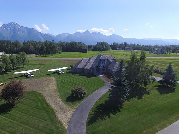 Pilots Dream! Enjoy living in a gated community on an airstrip. All living on the main floor including master bedroom/bath,great room,formal dining & laundry.(18 foot ceilings) Gorgeous architecturally appealing,home lives like a ranch.Located in Palmer on Sky Ranch airstrip.Home comes with three airplane tie downs & neighborhood approvals to build a hangar if you choose to do so. Acre plus lot (54,450 sq ft) an ideal valley location, perfect for valley residents or anchorage commuters. Easy commute, Google says 47 minutes from downtown anchorage by road or fly your own plane in minutes. Second floor has two bedrooms and bath - ideal for family members or out of town guests. Unfinished basement, plenty of storage, family area, weight room, etc. New owner just invested nearly 30,000 dollars in new custom interior paint, blinds , and high efficiency heating system. New owner is selling because of job transfer.