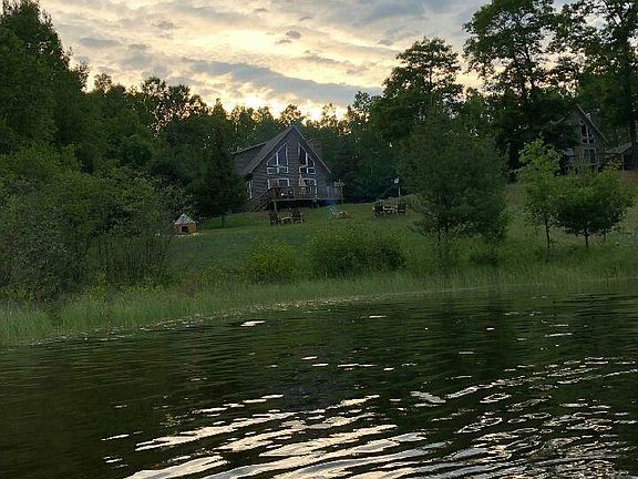 STUNNING WATERFRONT HOME- 3 bedroom, 2 bath home on 133 feet of frontage on a private lake. Floor to ceiling windows and a large deck overlooking the water offer gorgeous views in a quiet and wooded location. This updated and tastefully decorated home sits on 2.9 acres, with features such as stone fireplace, oak cabinets and cathedral ceilings. D-415