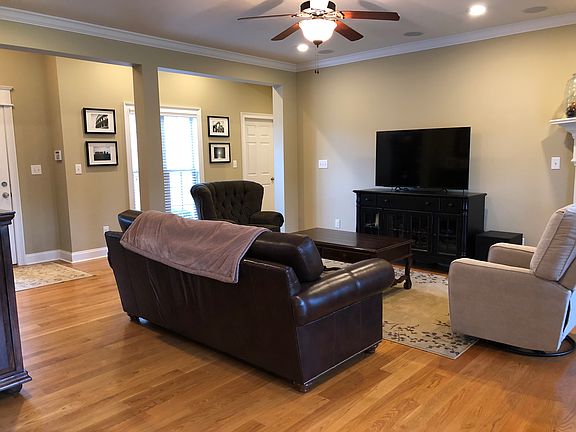 This location gives the best of both worlds when it comes to space and convenience. This home has a split floor plan with 3 bedrooms, 2 bathrooms, and a study. It also features many upgrades. For instance, it sits on a large private lot at the end of the cul-de-sac, it is prewired for a security system, security cameras are installed around the house, a large backyard patio, and tankless water heater. The living room has hardwood floors, a gas log fireplace, and flush mounted surround sound speakers that are perfect for game day. The kitchen has tile flooring, granite counter tops, tile backsplash, and stainless steel appliances. The laundry room has tile flooring and is oversized allowing it to also function as a mudroom. The master bedroom has hardwood floors, and the master bath features a whirlpool tub and an upgraded tile shower. The second bedroom has hardwood floors while the third bedroom has carpet. The study has hardwood floors.