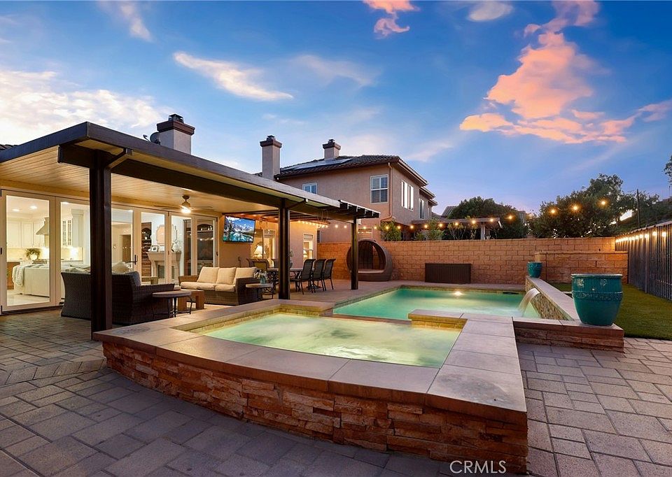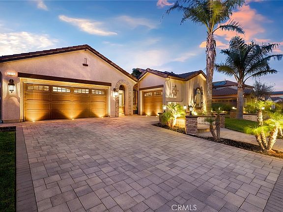 Gorgeous SINGLE-STORY luxury estate with a pool, perfectly situated on a cut-de-sac in one of the area's best locations, on a premium oversized lot in the scenic hills of Serrano Heights. You'll love coming home to this stunning BELLAGIO model, featuring over $400,000 in high-end upgrades that offer the ultimate in style and comfort. Step into the front courtyard, where a charming fountain sets the tone and invites you into a beautifully finished home filled with refined finishes and a lifestyle thoughtfully crafted to capture your heart and imagination. This 3-BR/2.5-BA home includes a custom primary suite where the original fourth bedroom was combined with the third to create an expansive suite retreat, complete with dual walk-in closets and a beautifully remodeled en-suite bath—easily converted back to a four-bedroom. The gorgeous formal living and dining rooms, complete with a butler's pantry, offer an elegant setting for everything from intimate gatherings to lavish celebrations. The family room boasts custom built-ins, a fireplace, surround sound and a striking wall of folding glass doors that highlight incredible backyard views. The show-stopping chef’s kitchen is a masterpiece in itself—equipped with Thermador stainless appliances, built-in refrigerator and wine cellar, gleaming granite counters with stone backsplash, oversized island with ice machine, walk-in pantry and breakfast nook. The luxurious master suite with double-doors, a custom walk-in closet and a spa-inspired bath featuring a jetted soaking tub, stone shower and dual vanities-an ideal space to relax and unwind. And then there’s the backyard—a spectacular outdoor paradise that must be seen to be believed. Nestled on a prized oversized lot, enjoy a resort-inspired backyard with a newly resurfaced saltwater pool, elevated spa and soothing waterfall feature. The beautifully landscaped backyard is an entertainer's dream space offering the ideal setting for outdoor dining beneath a custom-built Alumawood patio cover, built-in BBQ, fire pit and elegant paver flooring-all designed for intimate evenings or lively gatherings. Luxury extras include wide-plank wood & natural stone flooring, plantation shutters, electric window shades, crown molding, recessed lighting, fire sprinklers, newer pool equipment and a finished 3-car garage complete with built-in cabinetry and a custom stone-accented driveway. An extraordinary opportunity to own a standout property in Serrano Heights! Truly a must-see.