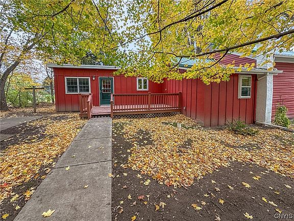 NEW PRICE! Beautiful setting! This property offers two driveway entrances to a circular drive way, huge green lawn beyond the tree line, two-car detached garage with bathroom and studio, patio, large deck, and shed. The original school house boasts a huge room with flex space. The addition offers an updated eat-in kitchen, an island, and full appliances. The owner's bedroom is spacious and has great closet space. There is a large living room with hardwood floors, more bedrooms, bathrooms, and unique areas. Central air and home generator have been installed. A fabulous opportunity!