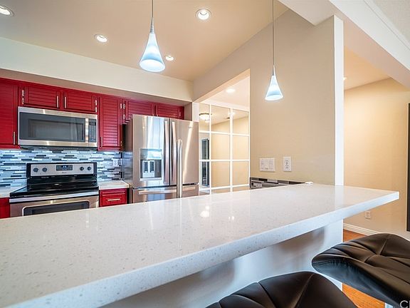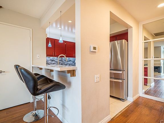 You are looking at a turnkey highly upgraded spacious 1 bedroom condo, perfectly situated in the best location of the community. This is a private unit with no one above or below. Step inside and you are greeted by gorgeous hardwood floors throughout the entire condo. The main level boasts an open floor plan concept with plenty of natural light. The kitchen has been tastefully upgraded with slab quartz counter tops, deep stainless steel sink, custom tile backsplash, and newer high-end stainless steel appliances. The flexible floor plan offers a dining area, bar seating at the kitchen, large family room with cozy fireplace, guest bathroom and a sliding door to your oversized patio. The patio boasts beautiful views of the pool and community. Upstairs you have an oversized bedroom featuring an additional retreat area. This spacious bedroom also offers a gorgeous community and city light view, tons of natural light, large walk-in closet, private laundry area, and an upgraded bathroom. Looking for additional storage? This condo features a large two car garage with custom built-in cabinets. Other great features of this condo are a newer AC unit, newer water heater, LED lighting, a smart thermostat and so much more. The community has three resort style pools, plenty of guest parking, and is located close to shopping, dining, and easy freeway access. This community is also FHA and VA approved.