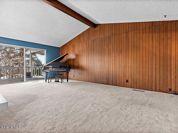Lovely 4-bd 2.5 ba mid-century modern home in quiet cul-de-sac neighborhood enjoys close proximity to the lake & downtown CDA. Southern views from floor-to-ceiling windows & sliders introduce lots of light and include MT views. The home includes vaulted ceilings, both gas and wood-burning fireplaces, and fully covered upper and lower decks. The upper deck runs the length of the home. The kitchen includes a dble wall oven, new gas range cooktop, and a bar counter. Both the master and the second bedroom have slider access to the back deck. The upper floor features recently updated mastr bath & A½ bath. The lower level has its own access, a fully equipped kitchen/dining with a gas range. The lower level could serve as an auxiliary dwelling unit or as a VRBO income opportunity. Greenhse with irrigation is attached & can be converted into a sunroom.