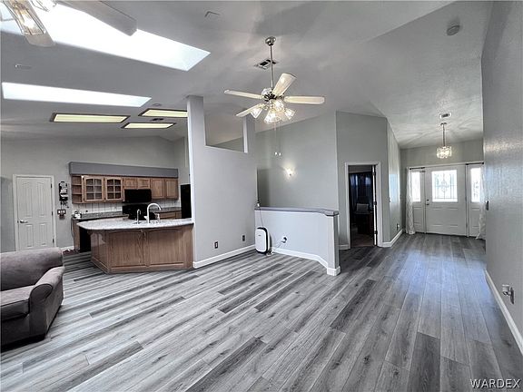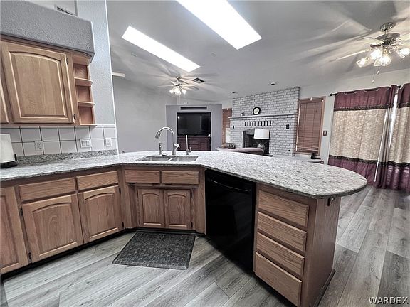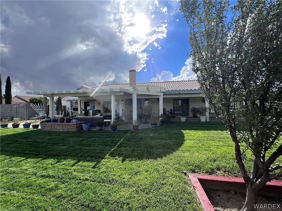 Seller is ready to move and will consider offers! Located at the foot of the beautiful Hualapai Mtns, this fabulous 3 bedroom, 2.5 bath home on park like half acre! Open floor plan, living room plus dining is a total of 27'.6 across, tv opening is 61"wide. Beautiful gas fireplace has blower and will keep you toasty during a cold spell. Newer upgraded flooring in living, dining, kitchen, hallways and entry. Spacious primary bedroom, has direct access to patio, walk in closet 6'.9 deep and 11'.9 at its widest spot with many shelves, master bath has cultured marble walk in shower, soaking tub, dual sinks, plenty of linen storage and cabinets. 2nd bedroom used as a second primary bedroom, entertainment/play/nook area 7'.6 x 5'.5, has a 7' x 8' walk in closet, private door to guest bath. Office/den/3rd bedroom with closet, spacious laundry room has lots of counter space, cabinets, built in ironing board, washer and dryer stay. 2 fixture 2nd guest powder room in hall. Kitchen is appointed with large walk in pantry, stainless/black appliances all stay, trash compactor, an abundance of gorgeous upgraded granite counters, many cabinets with pull outs and drawers. Many extra outlets for small appliances! Casual dining area and breakfast bar. Arcadia door takes you to the park like outdoor living space, huge oversized patio with extension, includes a BBQ area with natural gas, lush back yard, enclosed shaded garden area, many fruit trees, and sparkling cool "above ground pool". (Seller will remove pool if buyer does not want it). The front and back landscaping/lawn are on a automatic watering system. Block privacy wall, and cross fenced. Plenty of RV and toy parking, 2 sets of RV gates, one by the 4 vehicle driveway parking, that leads to the pool area, another one on the opposite side for large motor home parking, garden utility storage building, plus located about 2 blocks from outdoor recreation! Over-sized boat deep, 3 car finished garage with workshop, ladder access to attic storage space, many cabinets and evaporated cooling! Garage is a total of 31' wide and 2 bays are 24" deep, 1 bay is 22' deep. Workshop/golfcart/atv parking area is 16' deep x 7'wide. All room and garage measurements are approximate and to be verified by buyer. Good Morning, Terry/Seller will include one month lawn service and consultation with his gardener to familiarize with the system.