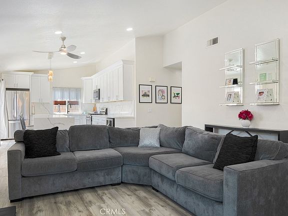 This corner lot location sits at the beginning of a cul de sac and offers plenty of parking with only 1 Neighbor next to you! It's light and bright and it has been REMODELED! There's Greige wide plank LVP flooring throughout the home with new Gray Carpet in the Bedrooms, the interior is freshly painted in a beautiful creamy color, and the BRAND NEW KITCHEN showcases white cabinets, quartz counters, and a waterfall Island with extra cabinets for storage! You can even fit stools on the other side! There is a deep farmhouse sink, stainless appliances, and a Wine Fridge! The Livingroom has a fireplace perfectly situated for gathering and it has been painted a striking charcoal color that really accentuates the room. The Primary Suite has a HUGE mirrored closet and an attached Bathroom with dual sink vanities. There is a Slider to access the Backyard too! The other 2 Bedrooms have an "open closet" and they are adjacent to the 2nd Bathroom, which has a single sink vanity and a shower/tub combo. You will LOVE this Backyard- besides being VERY LOW MAINTENANCE, it has a raised flower bed with a custom railroad tie retaining wall. The flower bed has a drip system and drainage for whatever gardening you want to do! The entire yard is concrete- there is a large above ground pool, some twinkle lights, and a cozy little seating area on the side yard with a firepit. It's a great space to unwind and enjoy the evening! The Garage has Epoxy Floors, there are new Vinyl Windows and Sliders throughout the home, there is new recessed lighting throughout the home, and the pride of ownership really shines through! You're minutes to the Menifee Town Center and in between the 15 and 215 Freeways. This is a great home and it's not going to last! Come see it today!