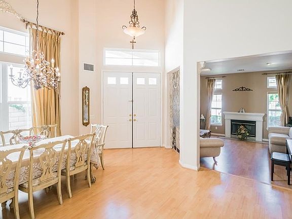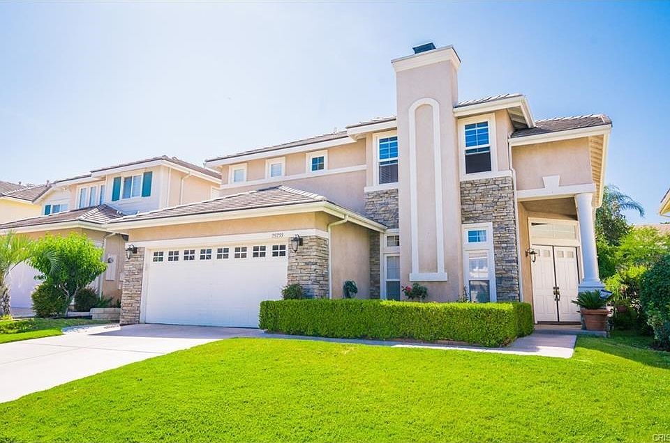 Nicely updated Stevenson Ranch 5 bedroom home. Very light, bright and open with soaring ceilings when you walk in, and nice engineered wood floors throughout. Remodeled kitchen with light crackle-finish cabinets, granite island and back-splash. Shutters and remodeled baths in neutral stone finishes. Floor plan features full bed & bath down, with 4 bedrooms & 2 baths up. Large master with fireplace and deck. Private pool sized lot, backs to hill. 2 car garage with epoxy floors.