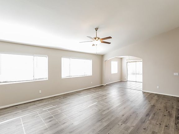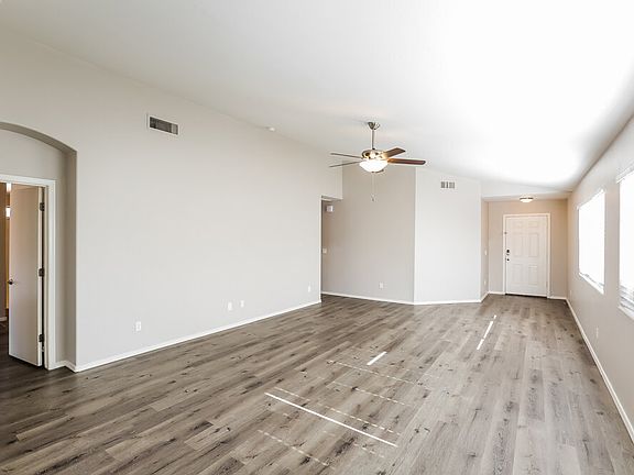 Please note, our homes are available on a first-come, first-serve basis and are not reserved until the lease is signed by all applicants and security deposits are collected. This home features Progress Smart Home - Progress Residential's smart home app, which allows you to control the home securely from any of your devices. Want to tour on your own? Click the "Self Tour" button on this home's RentProgress. Come check out this roomy Buckeye, AZ rental home featuring 1,574 square feet of living space. This four-bedroom, two-bathroom house is move-in-ready, and the two-car attached garage provides ample space for parking. The living room's vaulted ceiling, large windows, and vinyl plank flooring create a feeling of openness. Cooking in style is a breeze in the home's large kitchen, which features a breakfast bar area, stainless steel appliances, quartz countertops, and ample cabinetry. The primary bedroom is spacious with a bay window and a lighted ceiling fan hanging from the vaulted ceiling. You'll love having a walk-in closet for your wardrobe and an en suite bathroom with convenient dual vanity sinks. Enjoy time outdoors under the covered patio.