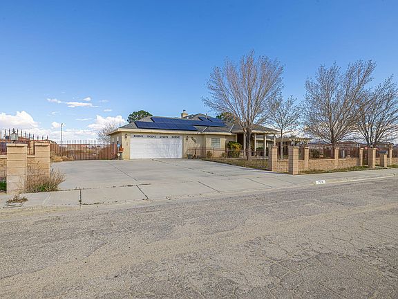 There is a huge Great room with 1/2 bathroom attached to an office space with built in desk and cabinets. The bedrooms are all on a separate wing of the home. The secondary bedrooms share a full bathroom with upgraded ceramic tile counter tops, flooring and fixtures . The primary bedroom space has attached bathroom with separate shower, walk in tub and bottle glass windows for privacy. The rear yard has a full length patio cover, fenced yard and mature landscaping. Large metal building with two roll up doors, 1 out building and 1 shed. Plenty of room for animals, toys and RV. Installed 2022 Solar system with Sunrun provides affordable utility cost. Centrally located in Rosamond near shopping, dining, fuel and Freeway.