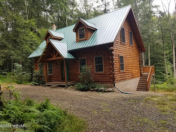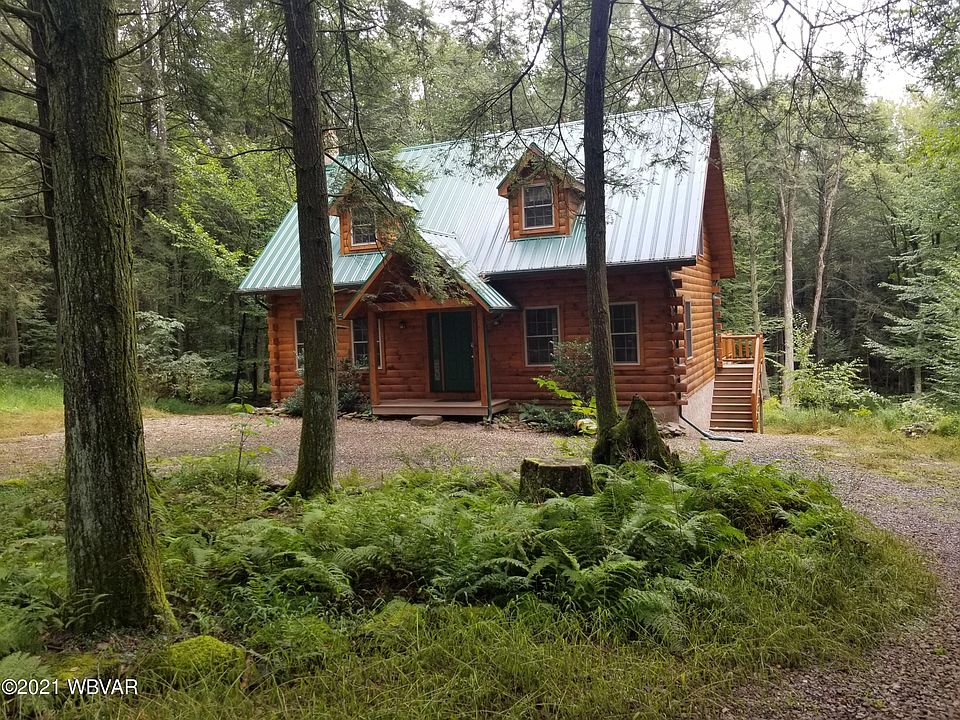 Enjoy Log home living with all the extras... Well-built log home on Dark Hollow Road in Lycoming County. Offering 8 bedrooms and 2 baths with open dining room and kitchen. Relax in the living room by the propane fireplace with a custom stone chimney from floor to ceiling. The upper level has seven bedrooms and a full bath. The lower level offers a game room, laundry, and a garage. Use it as space for your four wheelers and more. Exterior offers a large grilling deck overlooking ''Big Run'', a beautiful stream. Ready for some volleyball? Your own court is part of this property. Snuggled on 4.76+/- acres of wooded land. This property is turn-key and ready to start making memories in 2022. Oil, gas and mineral rights convey to the buyer along with royalties.