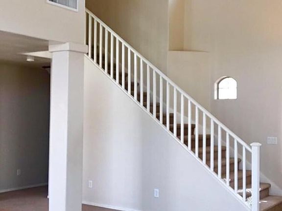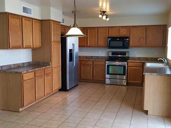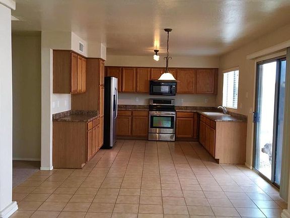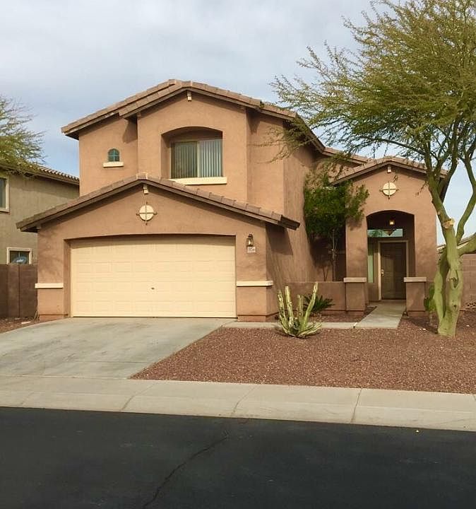 Beautiful 4 Bedroom 3 Bathroom house in Buckeye AZ located in the quiet community of Sunset Vista, walking distance from Bales Elementary. Vaulted ceilings in the living area as you walk in the house and a large open kitchen and dining area. The kitchen features black and stainless steel appliances. One bedroom with a walk in closet and a full bathroom downstairs. Upstairs is the master suite, two additional bedrooms and a second full bathroom. The master suite has two walk in closets, his and hers sinks, a stand-alone shower and a large bathtub. The backyard is a clean dirt lot with a covered patio.