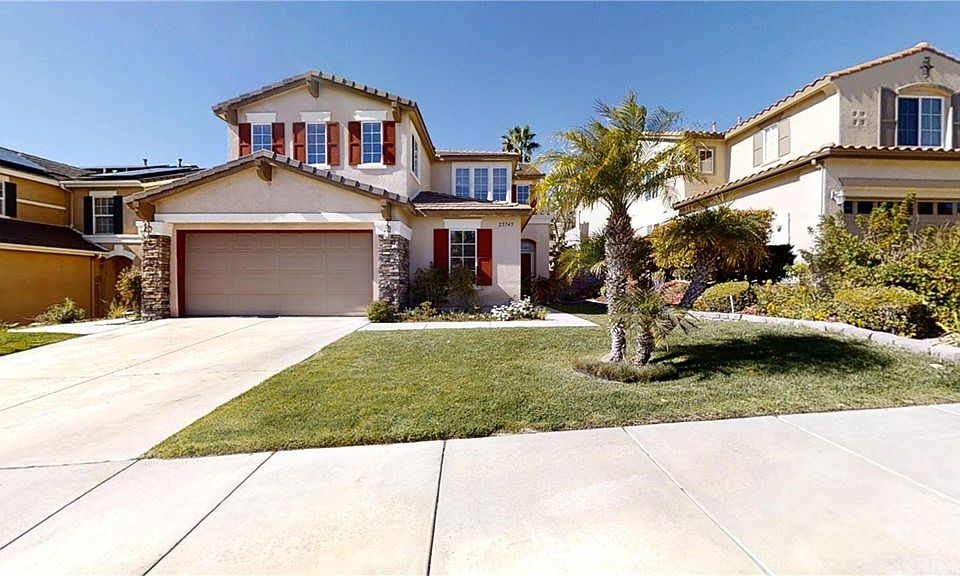 Stevenson Ranch Pool Home In Prime Location! This 4 bedroom + office + bonus room has the possibility to become 6 bedrooms. Upon entering the cathedral ceilings give an airy feel in the formal living room, with tile floors throughout the first level, a formal dining room, office & downstairs bedroom & bathroom with shower. The bright kitchen with an island opens to the family room with a stone fireplace. Convenient first level laundry room with sink. Upstairs is the master bedroom, a spacious bonus room and 2 more bedrooms with a Jack and Jill bathroom. The backyard is perfect for outdoor entertaining with a sparkling pool, spa, lounging area and grassy side yard. Solar panels are another added bonus to help bring down utility costs. Prime location, less than a block away to the sought-after Stevenson Ranch Elementary School and nearby Dr. Richard Rioux Park. Close to shopping, restaurants, freeway access & Award-Winning schools. Live in prestigious Stevenson Ranch!