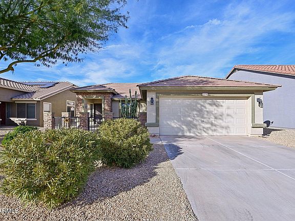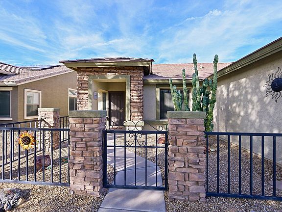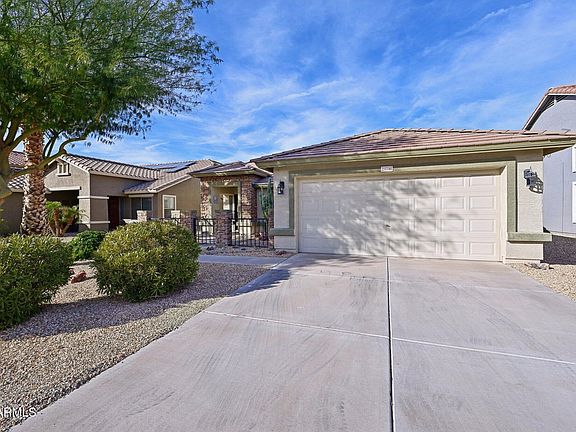 Enjoy comfortable living in Buckeye's desirable Westpark community! This beautifully maintained home offers the perfect blend of functionality and style. Mature landscaping and an extended driveway, ideal for accommodating your truck or other vehicles, create excellent curb appeal. A private, gated courtyard entry provides a welcoming and secure space to relax or greet guests. Inside, step into a spacious living area enhanced by vaulted ceilings, creating an open and airy atmosphere. A versatile den/home office offers a quiet space for work, hobbies, or relaxation. The desirable split floorplan ensures privacy for everyone, with the primary bedroom suite featuring a full bath, a large vanity, and a generous walk-in closet. The well-appointed kitchen is a chef's delight, boasting ampl e cabinets for storage, generous counter space for meal preparation, and a convenient pantry. Step outside to a low-maintenance backyard, complete with a raised planter box for your favorite plants and a high privacy wall for ultimate seclusion. This inviting home is ready for you to move in and enjoy!
