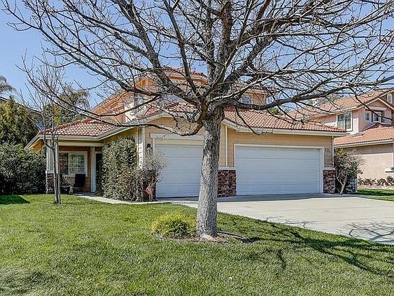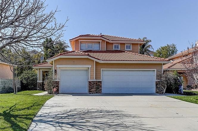 Welcome Home to this beautiful 2 story home in Stevenson Ranch.With a great end of culdesac location and beautiful views of the valley, to the 3 car garage with an extra long driveway easily fitting 6 cars, this home has it all. Entry is to living room currently being used as an art studio. This home boasts high ceilings with lots of windows and light. Cozy family room with fireplace off of the Updated kitchen with white shaker cabinets, granite counter-tops, stainless appliances and center island. Laundry closet off kitchen. Downstairs half bath has updated cabinet and granite counter-top. Downstairs features wood-like tile flooring, plantation shutters and duet blinds. Upstairs has sculpted neutral carpeting. Kids bedrooms have skylight window and shutters and peek a boo views of the hills. Master bedroom has a view of the backyard hillside. Master bathroom has separate tub and shower and a walk in closet.HUGE pool sized yard with beautiful flowers and grass and tons of space for entertaining. This home is a must see!