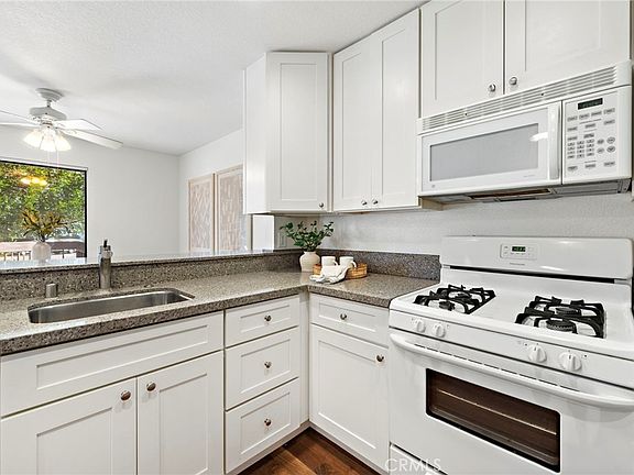 Located in the highly desirable White Oak community on an upper-level corner premium location. This 2 bedroom end unit offers an abundance of light with upgrades, an ideal location within the community surrounded by a surplus of open parking. Kitchen with white shaker cabinets, and quartz countertops and pantry has been remodeled by removing a wall between the kitchen and dining room with large breakfast bar opening all spaces to the living room. Spacious living room with brick fireplace and wall to wall of window providing lots of natural light and views of the patio. Two spacious bedrooms with ceiling fans and large bathroom features upgraded vanity with dual sinks and shower over tub. Relax on the spacious patio overlooking the greenbelt. Amenities include pool, two spas and low HOA dues. Conveniently located close to shopping, nearby parks and Saddleback Valley Unified school district schools, this condo is a must see.