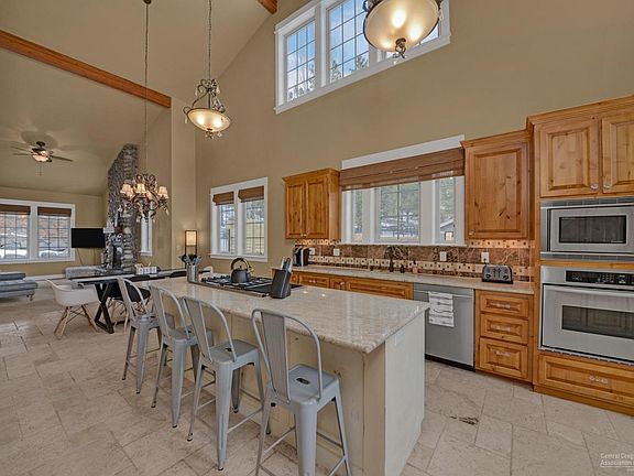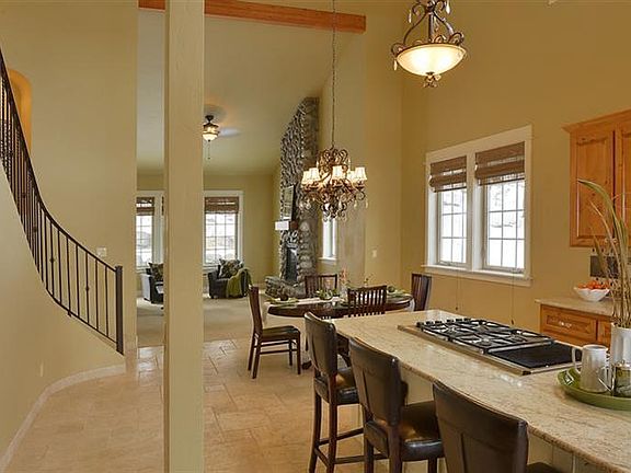 Tall cathedral ceilings w/ exposed beams establish the character of this luxurious Tudor-inspired Shevlin Ridge home. Two-story ceiling in central area above kitchen, dining, main level master suite & loft. Lovely kitchen has island w/ gas cooktop, slab granite counters, stainless appliances, tile floor. Master bath defines luxury w/ soaking tub, tile/glass shower, tile counters & tub surround. Open stairway w/ wrought iron balustrade & balcony rail. Bonus or 4th BR upstairs.