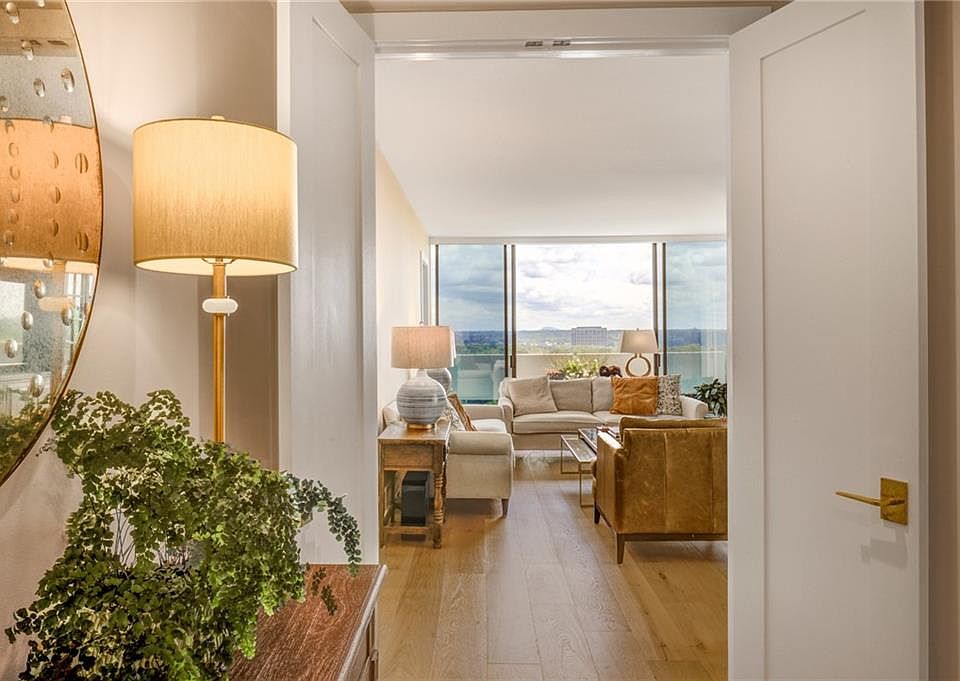 Back on the market- take advantage of this incredible chance to own the best 2-bedroom unit in Buckhead! 21st floor, spacious, completely renovated two-bedroom “E” unit offers gorgeous interiors with unparalleled panoramic views. This is a perfectly situated corner unit that opens up to completely private balconies in each direction. To the East, enjoy stunning sunrises, the tranquil Duck Pond, and Stone Mountain visible on the horizon. To the South, the Atlanta skyline glitters each evening. 21E has been thoughtfully redesigned to maximize both interior flow and those amazing views. The open kitchen reflects the light throughout the day with gorgeous custom cabinets, unlacquered brass, Zellige tile, a roomy cook-top island, marble countertops, Visual Comfort lighting, and Wolf/ Sub-Zero appliances. The space invites you to come in, relax, and enjoy life above the bustle of city life. Custom 8ft doors fitted with Emtek brass hardware and wide-plank European Oak floors are simply elegant. Separate laundry area is conveniently located off the kitchen. The generously proportioned primary bedroom faces eastward and includes a full walk-in closet, custom drawers and cabinetry for extra storage. Ensuite bathroom is decorated in neutrals of palest blue/green, with crystal pulls, brass accents, marble floors and counters, making this bathroom a spa-like retreat. The secondary bedroom is well-suited for overnight guests or as an office; either way it is a room with a stunning view of eastern skies and the lights of North Buckhead. Plaza Towers strikes a distinctive chord in Buckhead: historic mid-century modern architecture, ideal location amongst Peachtree’s most beloved neighborhoods, sparkling nightlife, world-class shopping, restaurants, and peaceful residential parks. HOA monthly fees include all utilities, trash service, pest control, and are based on each unit’s square footage. HOA initiation fee equals one-half of 1% of purchase price. Garage spaces are additional, starting at $30/month, and storage units are available at $50/month. Seller is licensed Associate Broker in the State of Georgia.