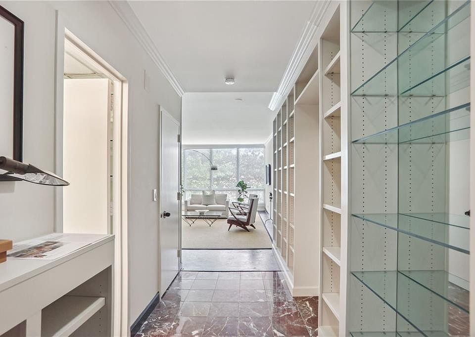 Located in Plaza Towers, this light filled one bedroom condo is perfect for the sophisticated buyer looking for a pied-a-terre, studio, or guest suite. The entry has newly installed floor to ceiling built-in bookcases perfect for a library or collector. The east facing living room has floor to ceiling windows looking out to garden courtyard offering a peaceful and private backdrop. The all-white galley kitchen is easy to cook in and opens to the spacious dining room. The bedroom features grass cloth covered walls and a nice size closet. Both bathrooms features the stylish grass cloth wallpaper and marble flooring. Right out the front door is access to the famous Duck Pond in Peachtree Heights, an ideal walking neighborhood. Plaza Towers has recently renovated all public rooms and guest suites making them a lovely place to entertain guests.
